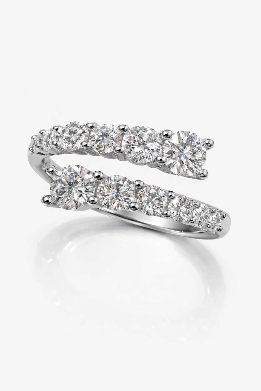 טבעת בעיצוב יוקרתי ומודרני, בעלת מבנה פתוח וייחודי, משובצת אבני Moissanite מעבדה בחיתוך עגול, באיכות הגבוהה ביותר בדרגת VVS ובצבע D, עם ברק עוצמתי ומראה המזכיר יהלום טבעי.
